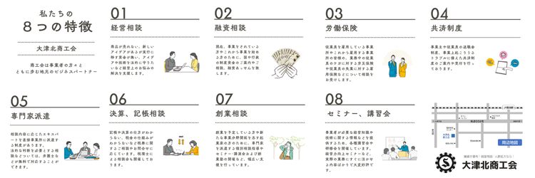 大津北商工会は、商工会法により組織された当地域を代表する唯一の経済団体であり、地域内の小規模事業者の経営・技術の改善や発達、地域経済活性化を目的としており、経営に関する相談に経営指導員が対応させていただきます。
